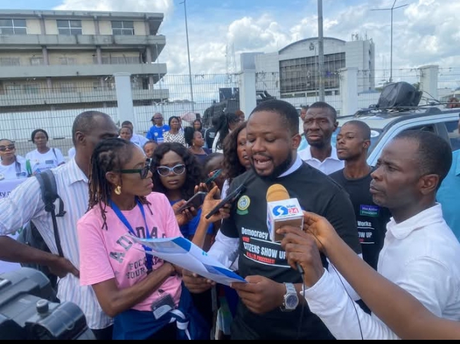Comrade Courage Nsirimovu delivering the Human Right Group’s position paper on the Rivers State crisis, June 18.