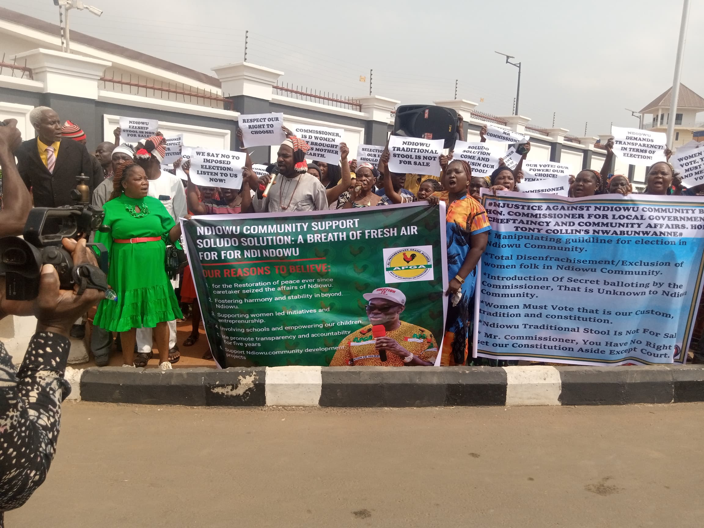 Bearing placards with inscriptions such as: “The stool of Ezediohamma Ndiowu is not for sale,” “Respect our right to choose,” “No to imposed election,” “Commissioner’s coup: respect our constitution,” “Women must vote, men must vote, youths must vote,” and “Soludo Solution, come and save our Eze stool,” they rejected the selection of Okeke-Ifi, stating that the process was imposed and illegal. They demanded a fresh election that adheres to the Ndiowu Town Union Constitution.